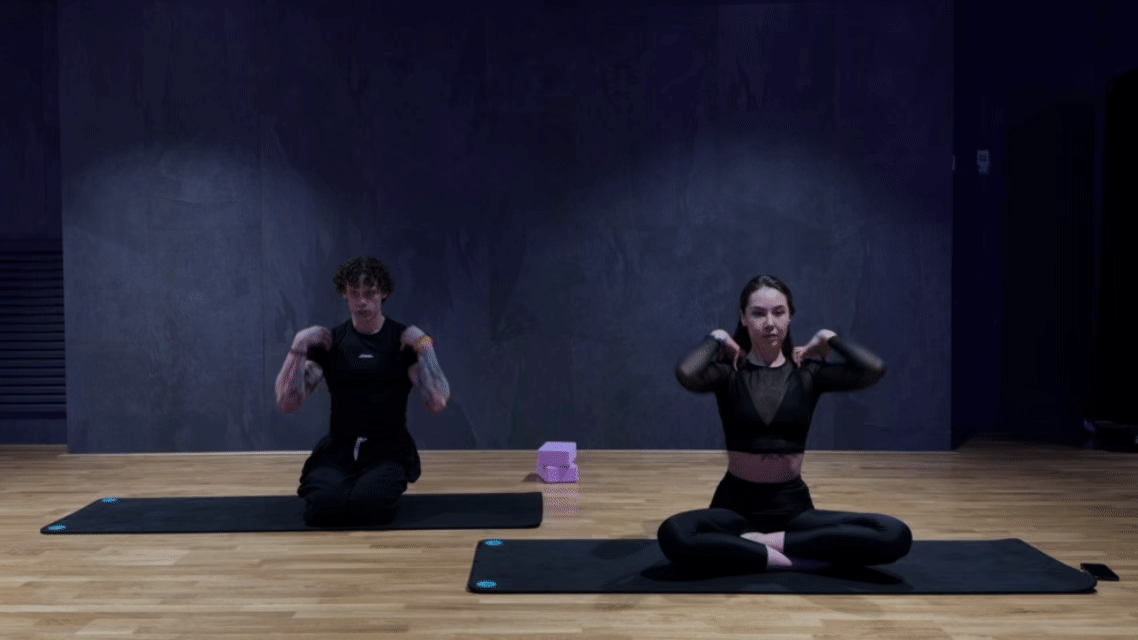 • на выдохе, медленно поворачивайте кисти рук назад, как будто хотите «показать» ладонями потолок, при этом сохраняя руки прямыми или с легким сгибом в локтях.Важно: движение должно идти из плеча, чувствуя растяжение. Можно делать каждую руку отдельно, поочередно (как на видео) или одновременно.